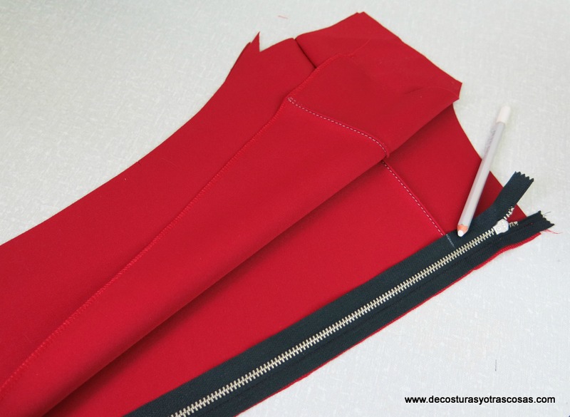 Se cose la primera cinta de la cremallera que estará completamente abierta. Se cierra la cremallera hasta arriba y se marca sobre la cinta que aún está suelta una señal en el punto justo donde debe coincidir el vivo. Se vuelve a abrir la cremallera y se prende ese punto marcado a la altura del otro extremo del vivo con un alfiler. Coser la segunda cinta cuidando que no se mueva el alfiler.
